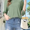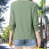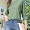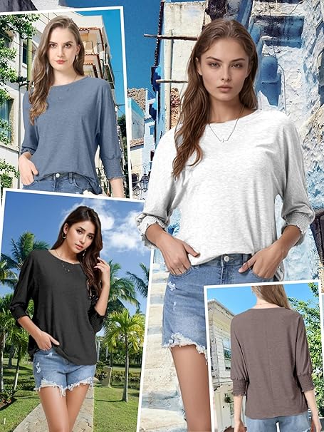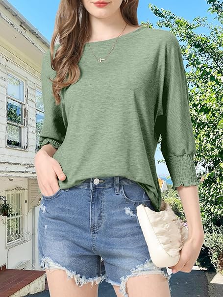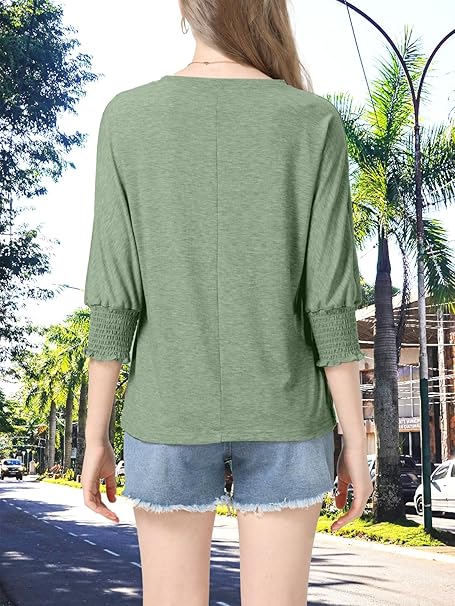 - Sem etiqueta! A etiqueta de tamanho está no lado inferior esquerdo interno da roupa ao usar. Características — Camiseta feminina, a gola redonda clássica pode mostrar perfeitamente seu pescoço, design de manga 3/4 de comprimento. Camisetas básicas com punhos com babados, apresentadas em um ajuste solto e design de manga plissada com costura frontal para um visual elegante